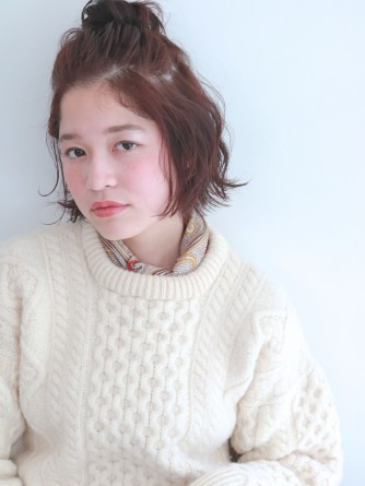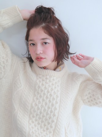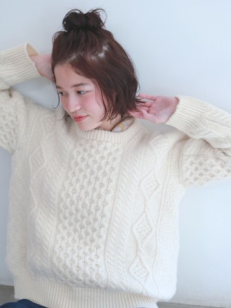 ゆるっとトップにまとめたhun hair. ベースに細かくランダムに巻いておくのが簡単にかわいくできるポイントです♩. ニットと合わせると抜群にかわいく◎◎