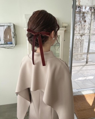 ロングヘアのヘアセットです! 大きいリボンを使ってあげる事で女性らしさがでて可愛いです!