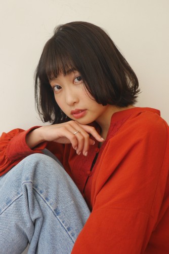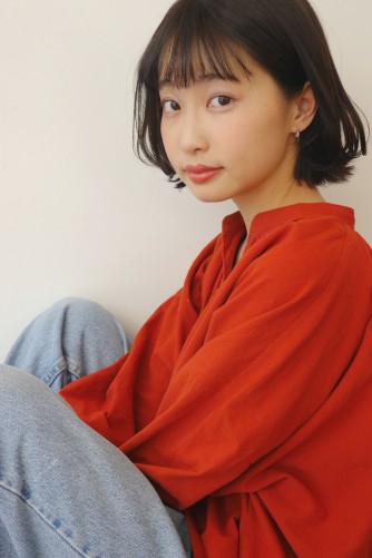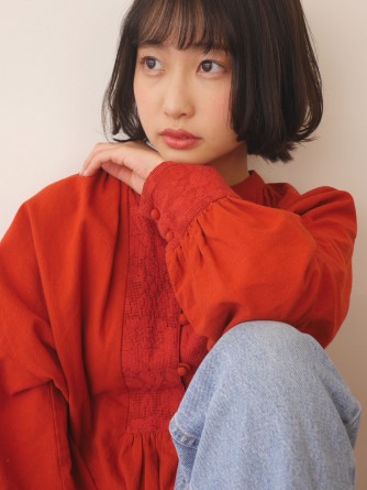 ワンレンボブです。スタイリングも毛先に内巻き、外ハネをミックスさせたラフに仕上がる簡単スタイリングで耳にかけてもかわいいです◎ カラーは赤味のない地毛風カラーです!